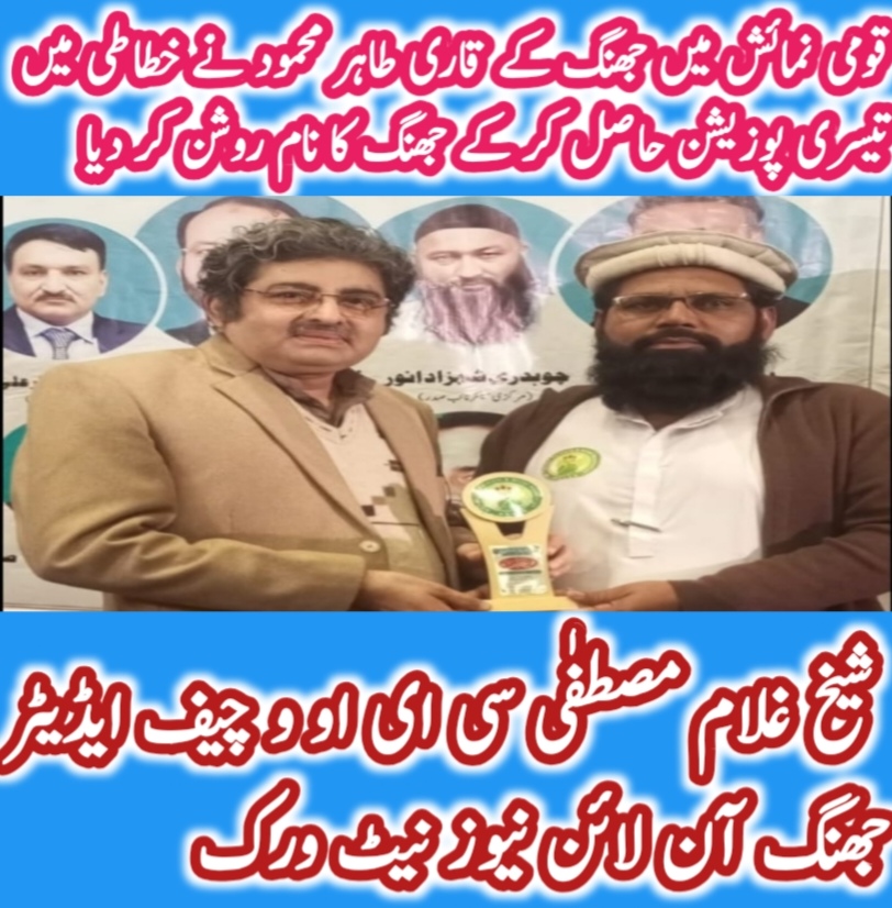 جھنگ (شیخ غلام مصطفیٰ ) آل پاکستان پینٹرز اینڈ آرٹسٹ ایسوسی ایشن کے زیر اہتمام قزافی سٹیڈیم میں منعقدہ عظیم قومی نمائش میں جھنگ کے قاری طاہر محمود نے خطاطی میں تیسری پوزیشن حاصل کر کے جھنگ کا نام روشن کر دیا، رپورٹ حکیم طاہر محمود جنجوعہ