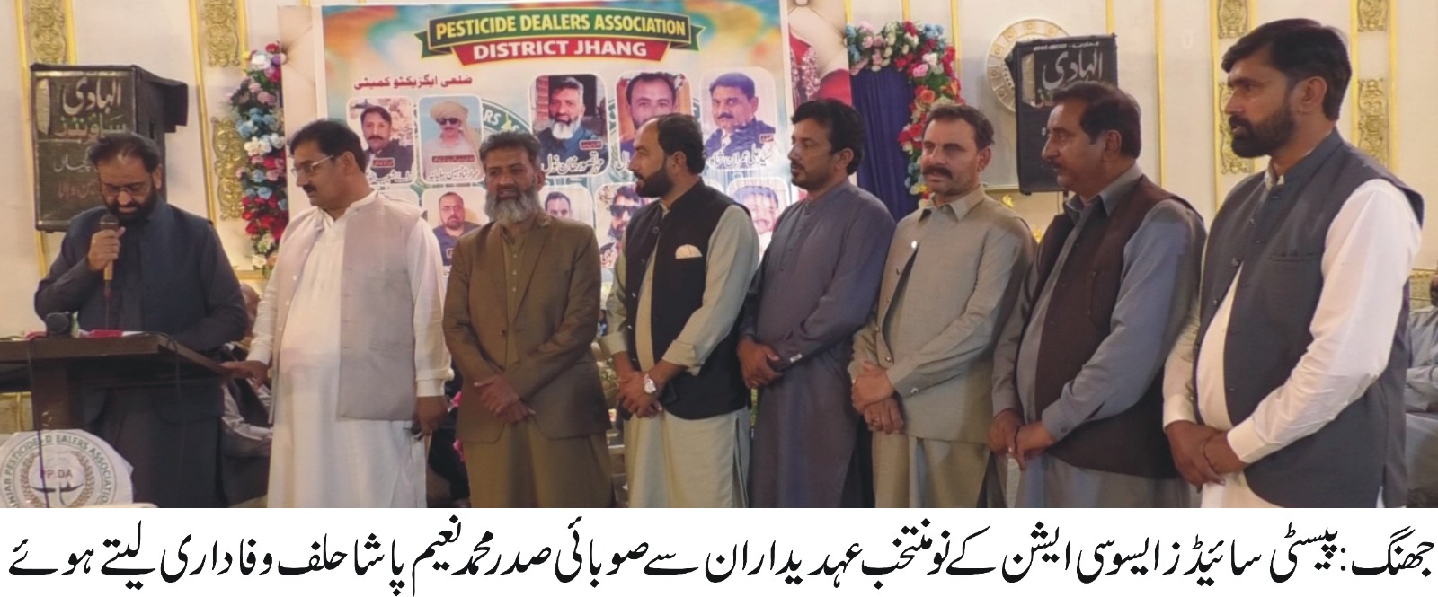 جھنگ (شیخ غلام مصطفیٰ ) پیسٹی سائیڈز ڈیلرز ایسوسی ایشن جھنگ کی تقریب حلف برداری مقامی ہال میں منعقد ہوئی جس میں صوبائی قیادت، ضلعی افسران اور ڈیلرز کی بڑی تعداد نے شرکت کی۔ تقریب میں صوبائی صدر محمد نعیم پاشا نے نو منتخب عہدیداران سے حلف لیا اور کسانوں و ڈیلرز کی فلاح و بہبود کے لئے ہر ممکن تعاون کی یقین دہانی کرائی، رپورٹ ڈاکٹر ظفر اقبال نول