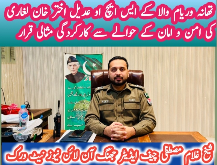 وریام والاجھنگ (شیخ غلام مصطفیٰ) ایس ایچ او تھانہ وریام والا عدیل اختر خان لغاری کی امن و امان کے حوالے سے کارکردگی مثالی قرار، جرائم کے خاتمے کیلئے اپنی ٹیم کے ہمراہ ہمہ وقت تیار، رپورٹ محمد رمضان سیال ،حکیم طاہر محمود جنجوعہ