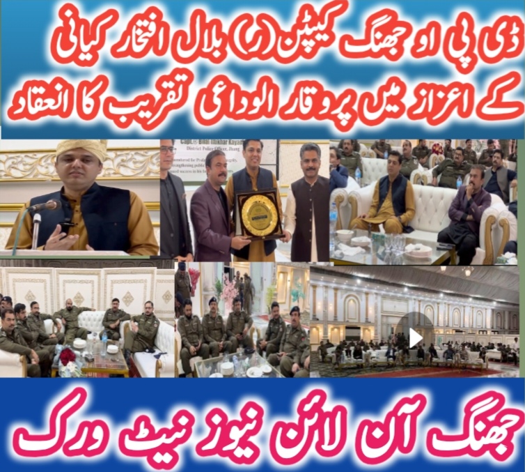 جھنگ ( شیخ غلام مصطفیٰ ) ڈسٹرکٹ پولیس آفیسر کیپٹن (ر) بلال افتخار کیانی کے اعزاز میں ایک پروقار الوداعی تقریب کا انعقاد کیا گیا، جس میں ڈسٹرکٹ اینڈ سیشن جج ظفر اقبال تارڑ، ڈپٹی کمشنر علی اکبر بھنڈر، نو تعینات ڈی پی او جھنگ ملک ساجد حسین کھوکھر سمیت دیگر اعلیٰ افسران شریک ہوئے۔ اس موقع پر ایس ڈی پی اوز، ایس ایچ اوز، برانچ انچارجز اور پولیس افسران کی بڑی تعداد بھی موجود تھی، رپورٹ حکیم طاہر محمود جنجوعہ