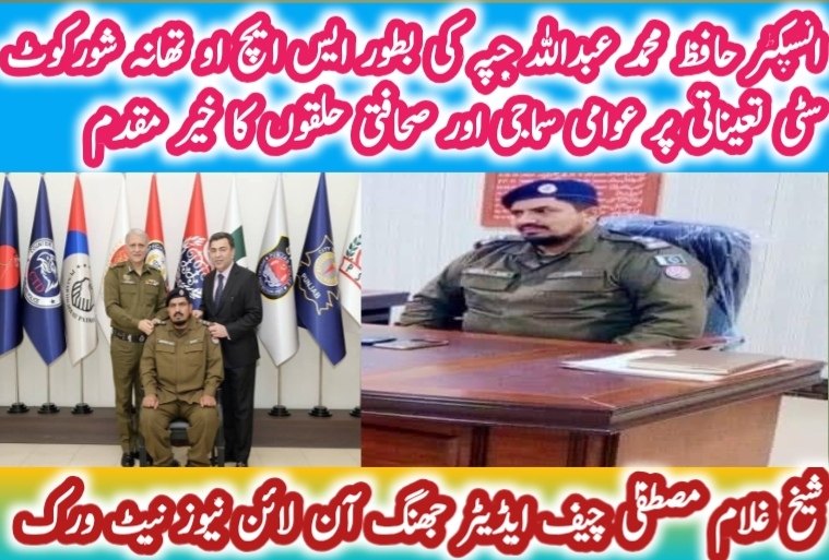 شورکوٹ (شیخ غلام مصطفیٰ) ضلع جھنگ کے متعدد تھانوں میں نمایاں کارکردگی کا مظاہرہ کرنے والے جھنگ پولیس کے مایہ ناز ایس ایچ او انسپکٹر حافظ محمد عبداللہ جپہ کی شورکوٹ میں تعیناتی، عوامی و سماجی حلقوں کی جانب سے خوشی کا اظہار ،جرائم پیشہ افراد کے خلاف کاروائیاں بدستور جاری رہیں گی، اعلی افسران کے اعتماد پر پورا اتروں گا، منشیات فروشی سمیت دیگر جرائم پر کنٹرول میری اولین ترجیح ہے، ایس ایچ او تھانہ شورکوٹ سٹی حافظ عبداللہ جپہ کی جھنگ آن لائن نیوز کے ساتھ گفتگو، رپورٹ حکیم طاہر محمود جنجوعہ ،شیخ احمد فیاض
