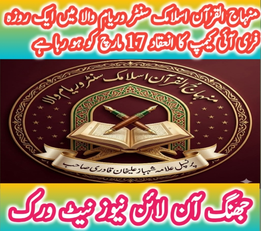 وریام والا جھنگ (شیخ غلام مصطفیٰ) منہاج القرآن اسلامک سنٹر وریام والا ضلع جھنگ میں جنت عزیز آئی ہسپتال کے تعاون سے ایک روزہ فری آئی کیمپ کا انعقاد 17 مارچ کو ہو رہا ہے، اہالیان علاقہ آئی کیمپ سے فائدہ اٹھائیں ،علامہ محمد شہباز قادری، مہر وسیم حیدر سیال ،رپورٹ حکیم طاہر محمود جنجوعہ