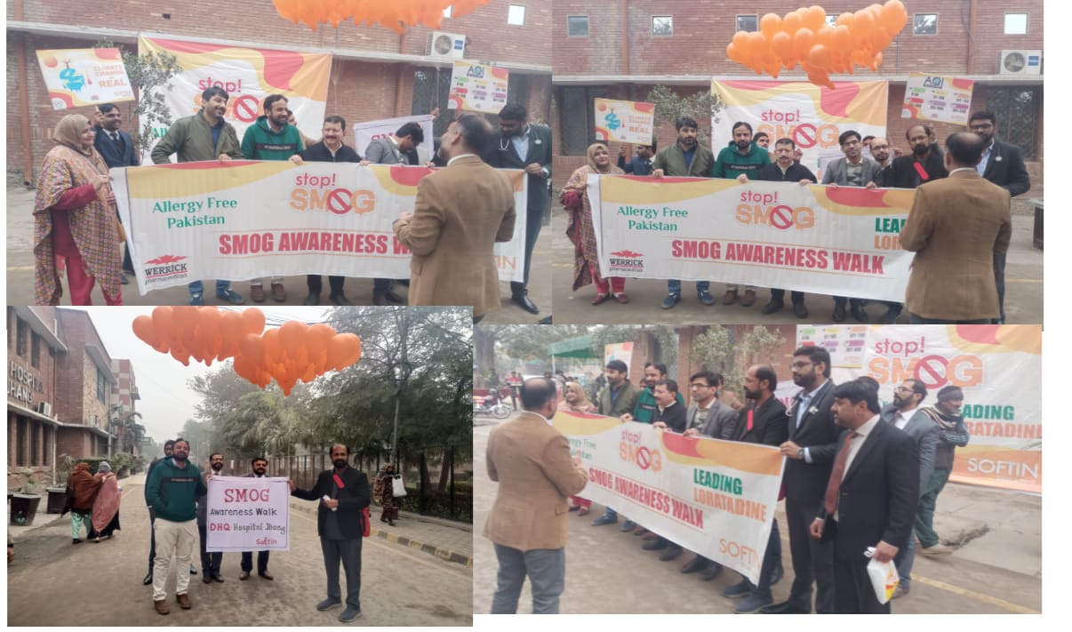 جھنگ ( شیخ غلام مصطفٰی )ڈسٹرکٹ ہیڈ کوآرٹر ہسپتال جھنگ میں سموگ آگاہی واک کا انعقاد کیا گیا، جس کا مقصد عوام میں سموگ کے اثرات کو کم کرنے کے لیے آگاہی کو فروغ دینا ہے۔آگاہی واک کی قیادت صدر پی ایم اے ڈاکٹر اعجاز سلطان اور عامر رضا بخاری زونل سیلز منیجر ویرک فارما سیوٹیکلز پاکستان نے کی جبکہ آگاہی واک میں کنسلٹنٹ ڈاکٹر توصیف اعجاز، ڈاکٹر لقمان علی، ڈاکٹر صغیر احمد اور ڈاکٹر اویس محمود سمیت پیرامیڈیکل سٹاف اور دیگر ڈاکٹرز نے شرکت کی، رپورٹ ڈاکٹر غلام اللہ فاروقی ،حکیم طاہر محمود جنجوعہ