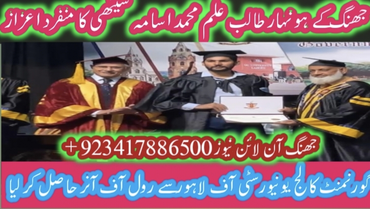 گورنمنٹ کالج یونیورسٹی لاہور کے منعقعدہ بائیسویں سالانہ کانووکیشن کےموقعہ پر جھنگ کانونہال نوجوان محمد اسامہ سیٹھی اپنے والدین کےھمراہ وائس چانسلر ڈاکٹر پروفیسر اصغر زیدی سے یونیورسٹی کا اعلی اعزاز رول آف آنر وصول کر رہا ھے جو کہ جھنگ کی نوجوان نسل کے لیے ایک فخر کی بات ھے-