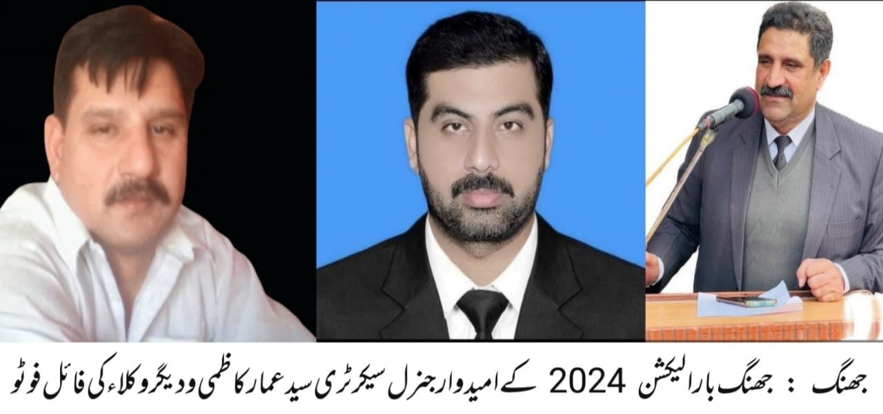 ڈسٹرکٹ بار ایسوسی ایشن جھنگ انتخابات 2024 کے لیے سالانہ انتخابات میں نوجوان ہر دلعزیز جنرل سیکرٹری کےلئے سید عمار کاظمی ایڈووکیٹ ہائی کورٹ سب کا پسندیدہ اور مضبوط امیدوار ہے اور سید عمار کاظمی ایڈووکیٹ نے اپنے استاد محترم سید ضیاء حسین کاظمی ایڈووکیٹ صاحب کا وژن کے مطابق کہ وکلاء سب سے پہلے، ہمیشہ کالے کوٹ کے وقار کو ہمیشہ بلند رکھنا میرے مقاصد ہیں-