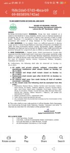 تمام پبلک اور پرائیوٹ سکول، کالجز، یونیورسٹی اور ایجوکیشنل انسٹی ٹیوٹ بند رہیں گے، تمام مارکیٹس، شاپس بند رہیں گی تاہم ریسٹورنٹ چار بجے سہ پہر کھولے جا سکیں گے، تمام شہری ماسک لازمی پہنیں گے باہر جاتے ہوئے، عوام کی سہولت کے لیے فارمیسی، میڈیکل سٹور، میڈیکل فسیلیٹیز، ویکسینیشن سنٹر، پٹرول پمپ، آئل ڈپو، تندور، بیکریز، کریانہ سٹورز، ملک، ڈیری شاپس، سویٹ شاپس، سبزیوں کی شاپس، فروٹ شاپس، یوٹیلیٹی سروسز، الیکٹرک، گیس، انٹرنیٹ سیلولر سروس، میٹ شاپس بھی کھلی رہیں گی..