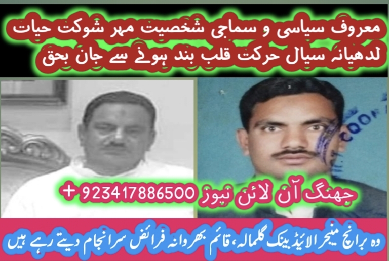 مہر شوکت حیات ولد حاجی نواز نمبر دار لدھیانہ سیال گھوڑیانوالا والے بقضائے الٰہی سے وفات پا گئے۔ مرحوم کی نماز جنازہ آج سہ پہر چار بجے ان کی رہائش گاہ پر ادا کی جائے گی.. مرحوم حرکت قلب بند ہونے سے خالق حقیقی سے جا ملے.