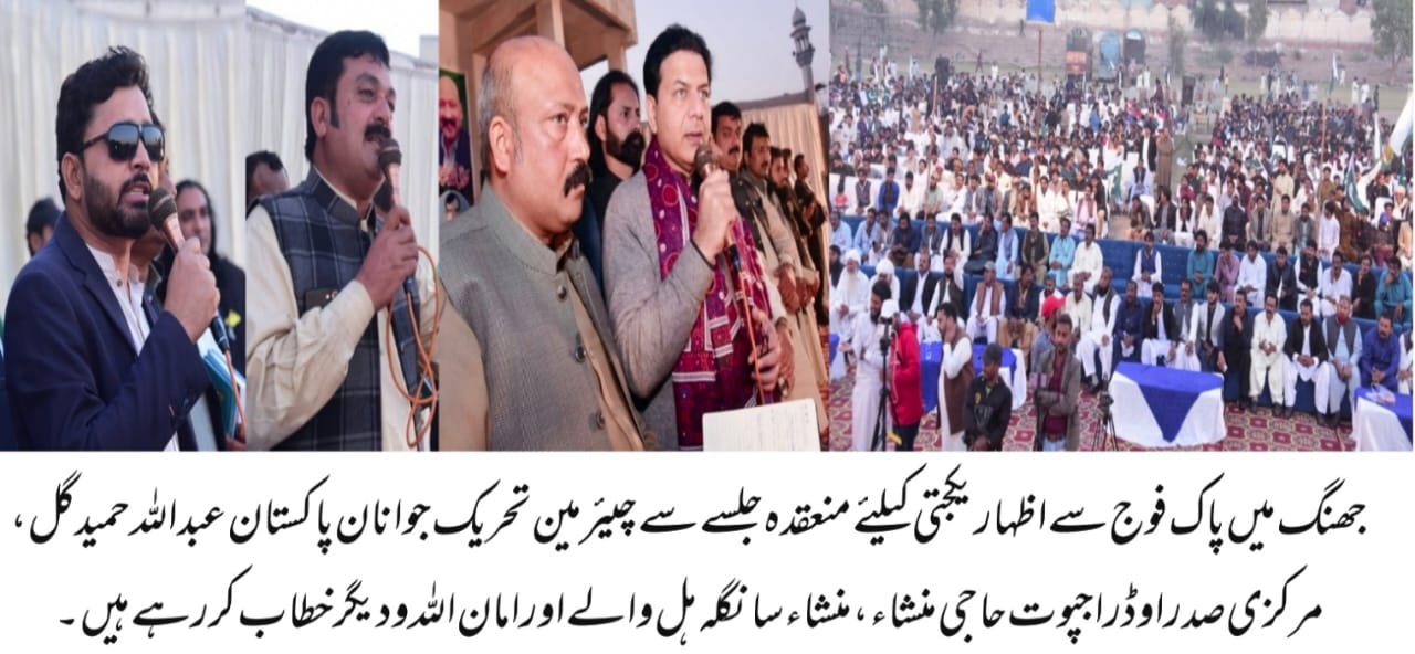 جھنگ ، پاک فوج سے اظہار یکجتی اور شہداء کی قربانیوں کو خراج تحسین پیش کرنے کیلئے آل پاکستان راجپوت اوڈ اتحاد اور تحریک جوانان پاکستان جھنگ کی جانب سے پاکستان زندہ باد ریلی و سمینار کا انعقاد کیا گیا جس میں چیئرمین تحریک جوانان پاکستان عبداللہ حمید گل نے خصوصی طور پر شرکت کی ۔ اس موقع پر جھنگ سے آل پاکستان راجپوت اوڈ اتحاد کے مرکزی صدر حاجی منشاء نے سینئر نائب صدر منشاء سانگلہ ہل ،