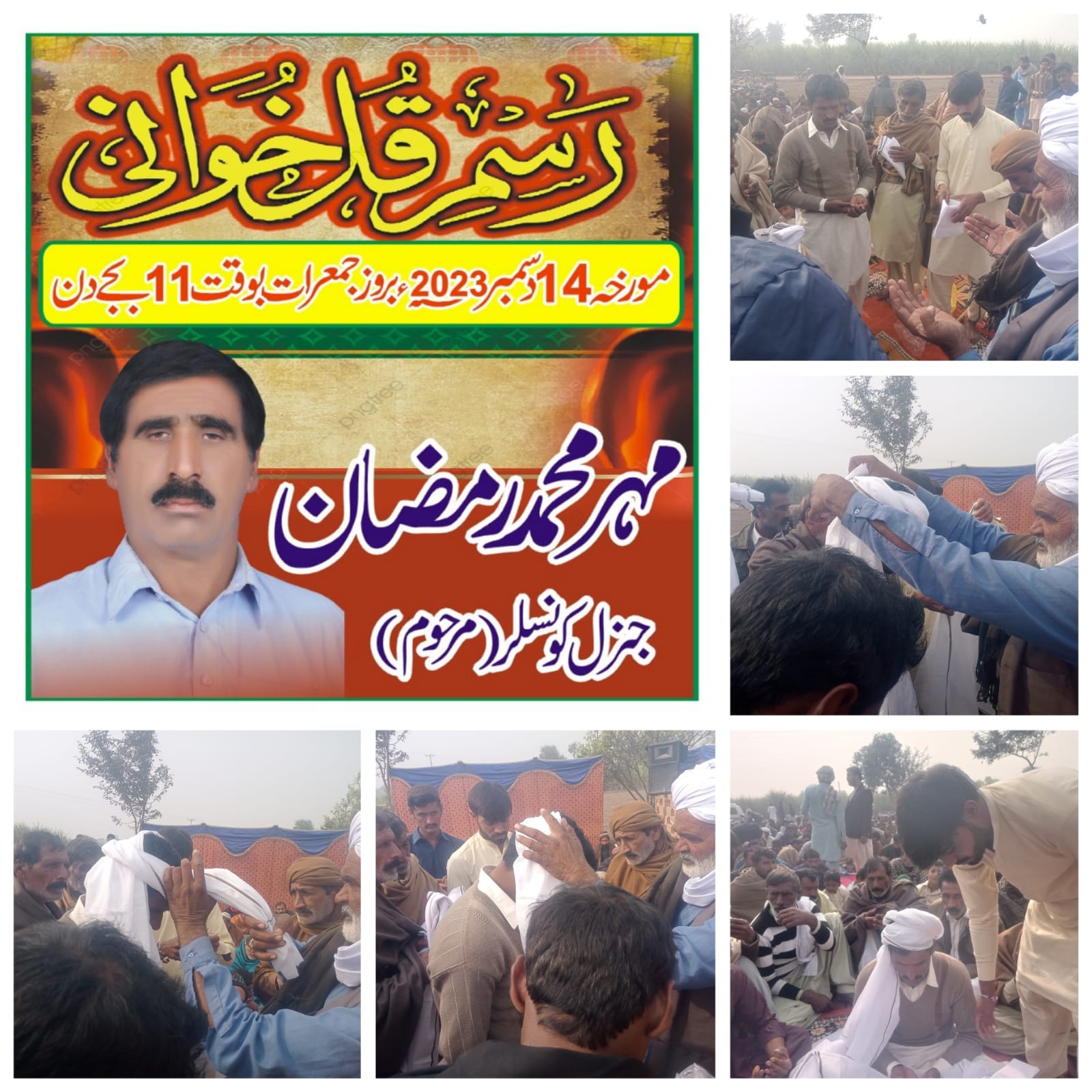 شورکوٹ ،مہر ریاض حسین موہانہ ممبر تحصیل پریس کلب شورکوٹ کے چچا جان مہر رمضان موہانہ وفات پا گئے تھے جن کی رسم قل خوانی شاہ صادق نہنگ چاہ ٹبی والا پر ادا کر دی گئی جس میں محمد اکرم طاہر کی دستاربندی کروائی گئی رسم قل خوانی میں ٹیم سرعام ضلع جھنگ اور تحصیل پریس کلب ®شورکوٹ کے صدر اورجملہ عہدیداروں اور صحافی سیاسی سماجی شخصیات نے کثیر تعداد میں شرکت کی-