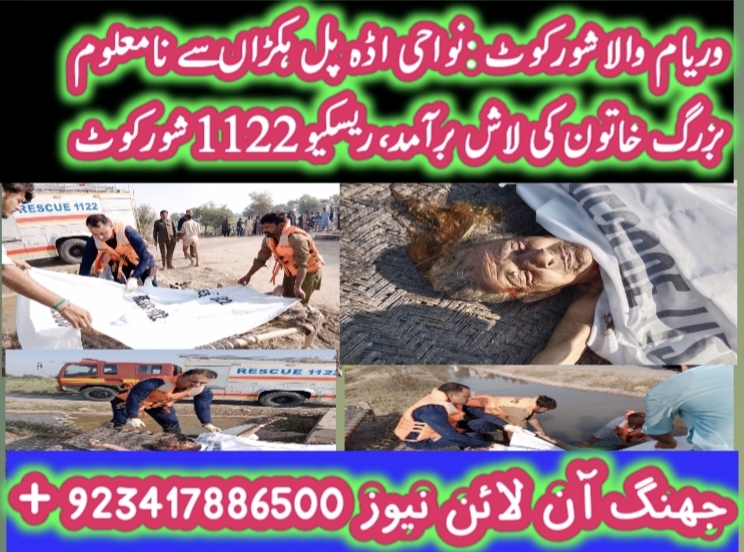 ا.*شورکوٹ* ریسکیو اہلکاروں نے بروقت رسپانس دیتے ہوئے پل کے نیچے پھنسی 65سالہ نامعلوم عورت کی ڈیڈ باڈی نکال کر پولیس کے حوالے کر دی
