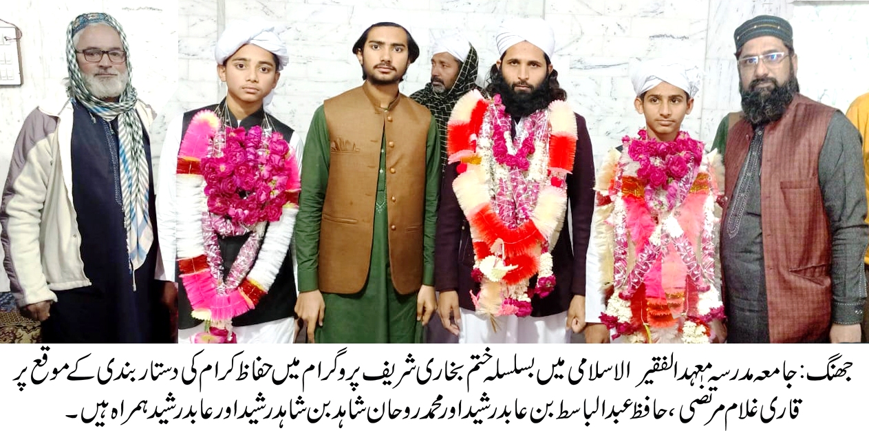 جھنگ۔۔جامعہ مدرسہ معہد الفقیر الاسلامی میں بسلسلہ ختم بخاری شریف پروگرام میں دورہ حدیث کے52 طلباءاور15 حفاظ کرام کی دستار بندی زیر سرپرستی پیر ذوالفقار احمد نقشبندی دامت برکاتہ کی گئی ۔ روح پرور تقریب میں پیر ذوالفقار احمد نقشبندی دامت برکاتہ نے دورہ حدیث کے طلباءو طالبات کو بخاری شریف کی آخری حدیث کا درس دیا اور بخاری شریف کی تعلیمات پر تفصیلی روشنی ڈالی جبکہ صاحبزاد ہ پیر حبیب اللہ نے علم کی روشنی پر تفصیلی بیان کیا۔ بعد ازاں دورہ حدیث کے طلباءاور حفاظ کرام کی دستاری بندی کی گئی۔ڈسٹرکٹ انفارمیشن آفس کے سینئر کلرک عابد رشید کے صاحبزادہ حافظ عبدالباسط اور بڑے بھائی شاہد رشید مرحوم کے صاحبزادہ محمد روحان شاہد سمیت حافظ حبیب اللہ خالد، حافظ محمد عثمان، حافظ محمد فرحان کی بھی دستار بندی کی گئی۔ اس موقع پر گفتگو کرتے ہوئے قاری غلام مرتضٰی نے اس امر کا اظہار کیا کہ قرآن کی تعلیم دنیا، قبر اور حشر میں کام آئے گی۔ قرآن پاک ایک مکمل ضابطہ حیات ہے،مدارس دین اسلام کے قلعے ہیں اور نو نہالان قوم کے تعلیم وتربیت کے مراکز ہیں۔ قرآن وحدیث کے تعلیمات پر عمل پیرا ہونے سے ہی دین ودنیا میں کامیابی حاصل ہوسکتی ہیں۔انہوںنے طلبہ کو نصیحت کرتے ہوئے فرمایا کہ ذوق و شوق، مسلسل مطالعہ اور گناہوں سے اجتناب ، یہ سب ایسی چیزیں ہیں جو حافظہ میں قوت کا سبب بنتی ہیں، اس لےے ہر عالم و طالب علم کو اس کا بھرپور خیال رکھنا چاہےے۔قاری غلام مصطفی نے اظہار خیال کرتے ہوئے کہا کہ قرآن کریم پوری کائنات کےلئے رشد و ہدایت کا اہم ترین ذریعہ ہے جس کے ہر لفظ میں برکت، حکمت اور فضیلت موجود ہے۔ خوش نصیب ہیں وہ والدین جو اپنے بچوں کو حفظ قرآن کی سعادت سے باریات کراتے ہیں۔قبل ازیں جامعہ معہد الفقیر الاسلامی جھنگ کے شیخ الحدیث نے ادارہ کی تعلیمی کارکردگی بیان کرتے ہوئے مزید یہ فرمایا کہ جامعہ میں اس سال 52فضلاءکرام اور 9مفتیان عظام اور 15حفاظ کرام تیار کئے ۔ اسی طرح جامعہ کے زیر انتظام شعبہ بنات میں ایک بڑی تعداد میں حافظات اور عالمات نے سند فراغت حاصل کی ۔ اس پر مسرت تقریب میں نمایاں کارکردگی دکھانے والے طلباءکرام کو ادارہ کی جانب سے انعامات سے نوازہ گیا۔یادرہے کہ جامعہ ہذا میں ایک اور شعبہ بھی ہے جس میں عصری علوم حاصل کرنے والے حضرات علوم بنویہ سے بھی مستفید ہو رہے ہیں۔جس کو ای معہد(E Mahad) کے نام سے جانا جاتا ہے۔