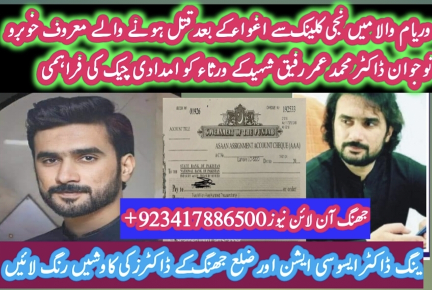 ۔ یاد رہے ڈاکٹر عمر رفیق کے تمام ملزمان جیل میں ہیں اور عدالت میں ڈاکٹر کمیونٹی مسلسل کیس کی پیروی کر رہی ہے۔ واۓ ڈی اے جھنگ اعلی قیادت ڈاکٹر شعیب نیازی، ڈاکٹر اورنگزیب گجر اور ڈاکٹر وسیم کی مشکور ہے-