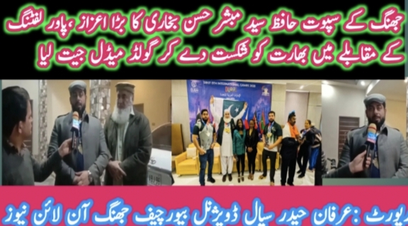 جھنگ کے سپوت جھنگ کے فخر حافظ سید مبشر حسن بخاری جن کا تعلق جھنگ سے ہے اور یہ سترہ سال سے دبئی میں مقیم ہیں انٹرنیشنل مقابلوں میں حصہ لیکر پاور لفٹنگ میں انڈیا کو مات دیکر گولڈ میڈل اپنے نام کرلیا اور پاکستان کا نام روشن کردیا دبئی میں اپنی کامیابی کے جھنڈے لہرا دیے جو ہمارے جھنگ بلکہ پاکستان کے لیے فخر کی بات ہے یاد رہے کہ جھنگ کا یہ پہلا سپوت ہے جنہوں نے گولڈ میڈل اپنے نام کیا اب تک کتنے میڈل اپنے نام کیے انکے استاد کون ہیں انکا تعلق کہا سے ہیں مزید تفصیلات جانتے ہیں عرفان حیدر سیال کی رپورٹ میں