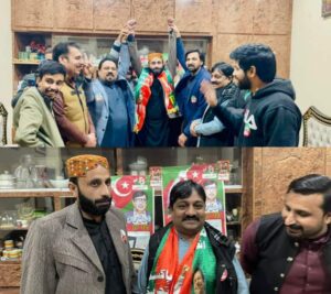 اس موقع پر پاکستان تحریک انصاف کے انفارمیشن سیکریٹری ملک فیضان احمد ، جنرل سیکرٹری سٹی فیصل نذیر خان ، سٹی صدر جمشید خان ، سینئر رہنما رانا اورنگزیب نے انکو مفلر پہنا کر پارٹی میں خوش آمدید کہا ۔