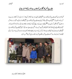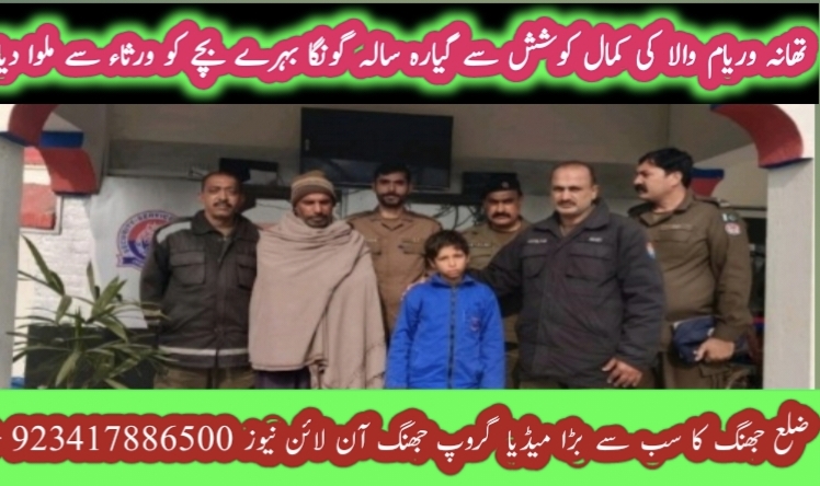 وریام والا شورکوٹ (شیخ غلام مصطفٰی) تھانہ وریام والا پولیس کی کمال کوشش کے بعد تھانہ وریام والا کے علاقے سے ملنے والے گیارہ سالہ گونگا بہرے بچے کو ورثاء سے ملوا دیا ،بہتر حکمت عملی کے زریعے سوشل میڈیا پر شئر کرکے جس پر تھانہ کوتوالی کے علاقہ کے رہائشی شخص نے پڑھ کر تھانہ وریام والا رابطہ کرکے اپنے بیٹے کو واپس گھر لے گئے.