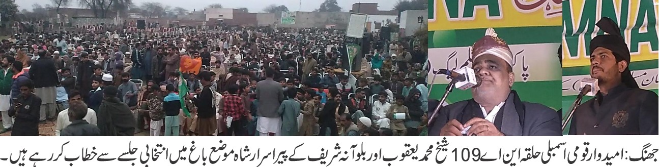 تاکہ موضع باغ کے شہری سستی ٹرانسپورٹ کی سہولت سے مستفید ہو سکیں۔ ان خیالات کا اظہار انہوںنے گزشتہ روز موضع باغ میں انتخابی جلسہ عام سے خطاب کرتے ہوئے کیا۔اس موقع پر دربار بلوآنہ شریف کے پیر اسرار شاہ نے اپنے مریدین سمیت شیخ محمدیعقوب کی بھر پور حمایت کا اعلان کیا ۔ شیخ محمد یعقوب نے کہا کہ قدیم ضلع جھنگ اور خصوصاََ شہری حلقہ این اے 109بہت سی بنیادی سہولیات سے محروم ہے۔