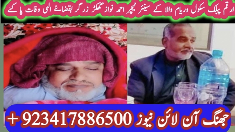 وریام والا ،بستی نور اباد وریام والا کے رہائشی محمد نواز زرگر نور محمد زرگرکا بھانجا محمد اقبال زرگر کا کزن مستری محمد نواز حق نواز محمد ریاض مستری محمد ناصر کا بھائی ماسٹر احمد نواز زرگر ارقم پبلک سکول والے انتقال کرگئے ہیں مرحوم کی نماز جنازہ اج 2,30بجے بستی شریف اباد عید گاہ میں پڑھائی جائے گی-