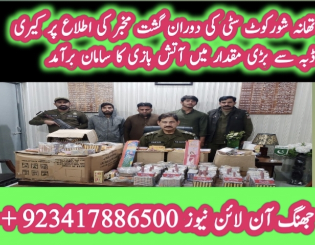 ایس ایچ او تھانہ شورکوٹ سٹی فیصل رزاق کاہلوں کی زیرنگرانی سب انسپکٹر اشفاق انجم کی پولیس ملازمین محمد باسط’ اعجاز احمد ‘ عمران ‘ ڈرائیور محمد اعجاز کے ہمراہ دوران گشت مخبر کی اطلاع پر بروقت کاروائی کرتے ہوئے سفید رنگ کیری ڈبہ کو روک دوران تلاشی بڑی تعداد میں آتشگیر مادہ آتشبازی کا سامان برآمد کر لیا –