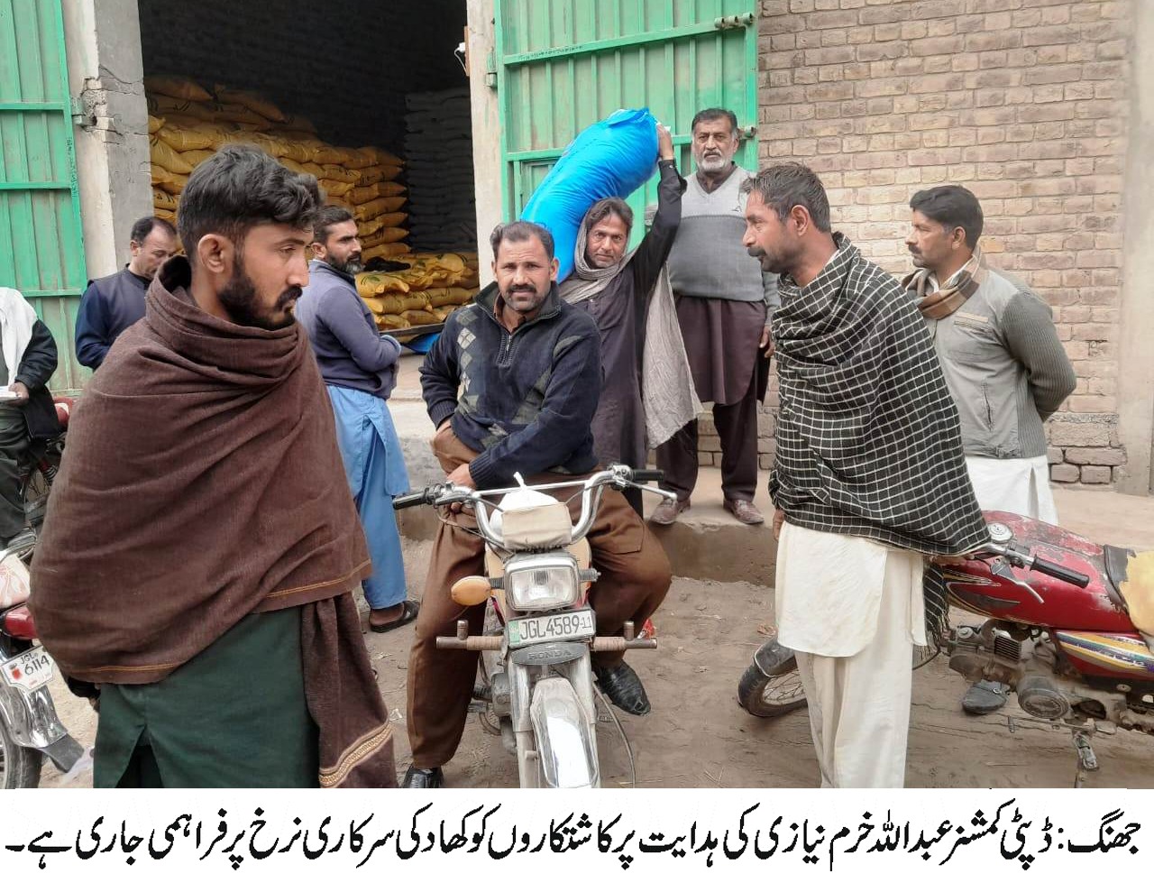 جھنگ ()حکومت پنجاب کی ہدایات پر کاشتکاروں کو کھاد کی فراہمی کو یقینی بنانے کے حوالے سے ضلعی انتظامیہ متحرک ہے۔ اس ضمن میں ڈپٹی کمشنر عبداللہ خرم نیازی کی ہدایت پر اسسٹنٹ ڈائریکٹر زراعت توسیع محمد ناصر سیال نے مختلف کھاد ڈیلر شاپس کا دورہ کیا جہاں انہوں نے کھاد کی طلب و رسد سمیت ریکارڈ اور کاشتکاروں میں سرکاری نرخ پرکھاد کی تقسیم کا جائزہ لیا۔