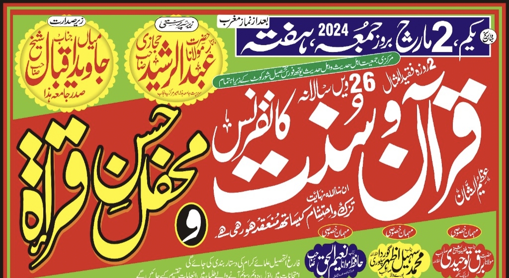 وریام والا،جامعہ تعلیم القرآن والحدیث کوٹلہ محمد ظریف خان میں 2روزہ 26 ویں سالانہ قرآن وسنت کانفرنس و محفل حسن وقرات کی تقریب زیر سرپرستی مولانا عبد الرشید حجازی زیرصدارت میاں جاوید اقبال شیخ منعقد ہوری ہے-
