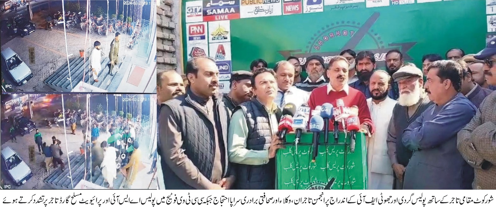 اور تاجر عتیق الرحمن اور بیٹے پر اغواء کا جھوٹا مقدمہ بھی درج کردیا واقع کی مکمل سی سی ٹی وی فوٹیج منظر عام پر آنے کے بعد پولیس کی فرضی کاروائی بے نقاب ہوگئی پولیس کی جانب سے غنڈہ کردی کرنے پر شورکوٹ سٹی کی انجمن تاجران کے صدر حاجی محمدحسین تاج،جنرل سیکرٹری انجمن تاجران حاجی محمدآصف، صدر بار ایسوسی ایشن سجاد حسین سیالوی،جنرل سیکرٹری بارایسوسی ایشن حافظ قیصر محمود،صدر پریس کلب شورکوٹ رانا شاہد محمود،جنرل سیکرٹری پریس کلب شورکوٹ سہیل راحت،چیئرمین پریس کلب وممبرضلعی امن کمیٹی رائے ایازاکبر،صدر نیشنل پریس کلب غلام شبیرطاہر،صدر تحصیل پریس کلب حاجی ناصر جٹ،سابق صدر انجمن تاجران یوسف جھنگوی، نمائندہ سنو نیوز خالد شہزاد شورکوٹ تاجر برادری،وکلاء اور صحافیوں کی بڑی تعداد نے پریس کانفرنس کرتے ہوئے کہاکہ پولیس کی جانب سے معزز تاجر کے ساتھ ہتک آمیز رویے اور تھانہ شورکوٹ پولیس کی جانب سے معزز کاروباری شخصیت کے خلاف جھوٹے مقدمے کی پرزورالفاظ میں مذمت کرتے ہیں-