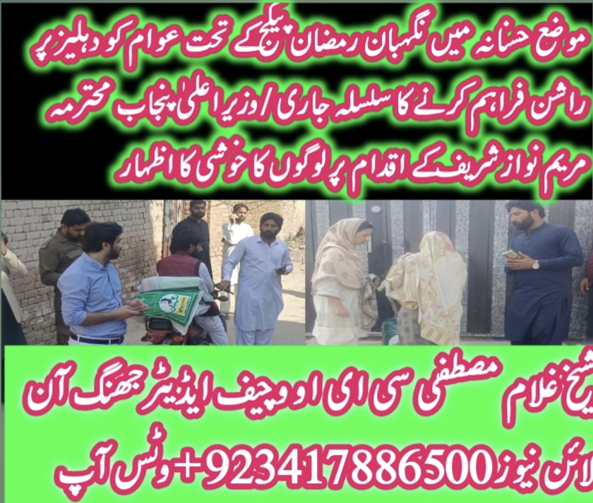 جھنگ میں متعلقہ پٹواری حضرات لسٹ کے مطابق نگہبان راشن دہلیز پر شفاف طریقے سے پہنچارہے ہیں موضع حسنانہ کے قابل فرض شناس پٹواری مہر قیصر حیات نول ہمراہ افسران بالا ایڈیشنل کمشنر ریونیو ابوبکر ، اسٹنٹ کمشنر جھنگ میڈم مہام اور نائب تحصیلدار مہر رب نواز کی زیر نگرانی پٹواری حلقہ موضع حسنانہ نے شفاف طریقے سے موضع حسنانہ کے علاقے آج اہل حضرات کی دہلیز پر راشن پہنچایا-