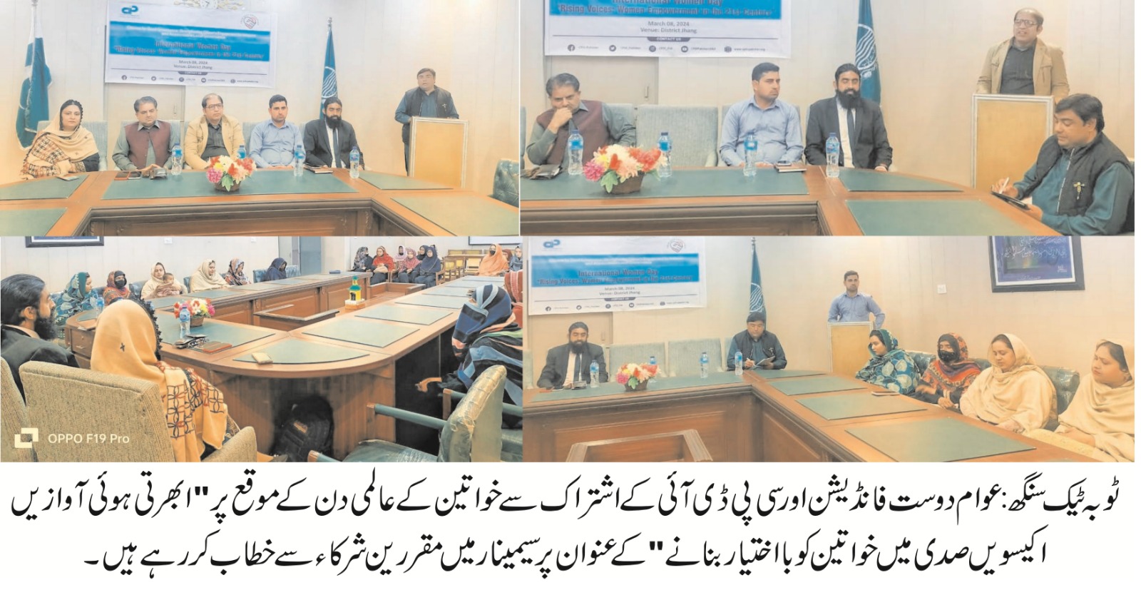 ۔سیمینار میں عوام دوست فاونڈیشن کے فوکل پرسن آصف منور،حیدر علی شاہ ایڈووکیٹ،شاہد امین سوشل ویلفیئر آفیسر،سید محمد عباس رضوی ڈسٹرکٹ منیجر صعنت زار نے شرکاء سے خواتین کے عالمی دن کے موقع پر گفتگو کی۔ آصف منور