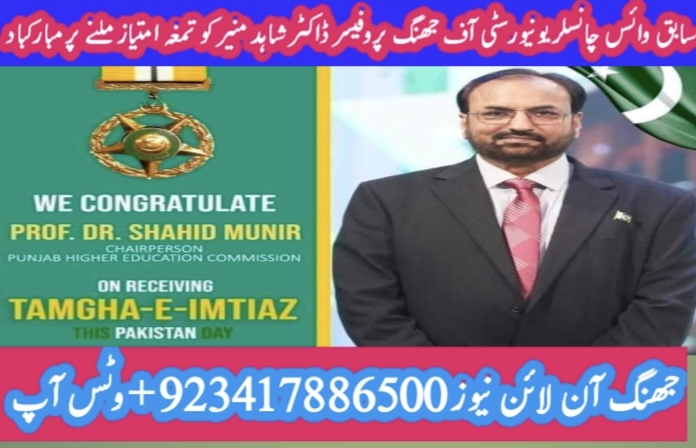 جھنگ (شیخ غلام مصطفٰی) یونیورسٹی آف جھنگ کے لئے گراں قدر خدمات سرانجام دینے والے سابق وائس چانسلر یونیورسٹی آف جھنگ پروفیسر ڈاکٹر شاہد منیر کو تمغہ امتیاز پاکستان ملنے پر ضلع بھر کے صحافیوں ،سیاسی و سماجی شخصیات اور یونیورسٹی آف جھنگ کے پروفیسرز اور طلباء کی طرف مبارک باد دی گئی ہے.
