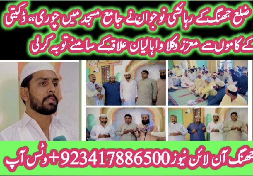 وریام والا جھنگ (شیخ غلام مصطفٰی) تھانہ وریام والا کے علاقہ چک نمبر 490 ج ب وڑائچاں والا کے رہائشی احتشام عادل عرف شیبی وڑائچ نے معزز وکلاء ،اہالیان علاقہ کے سامنے جامع مسجد میں چوری، ڈکیتی کے کاموں سے توبہ کرکے آئندہ ایسا فعل نہ کرنے کا اعلان کردیا، آئی جی پنجاب ،ڈی پی او جھنگ ،ڈی پی او ٹوبہ ٹیک سنگھ سمیت دیگر پولیس افسران سے معافی مانگ لی، رپورٹ بلال وڑائچ