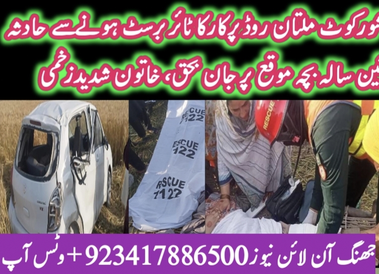 شورکوٹ//ملتان روڈ ششماہی پل کے قریب ٹریفک حادثہ،3سالہ بچہ جان بحق دو افراد زخمی