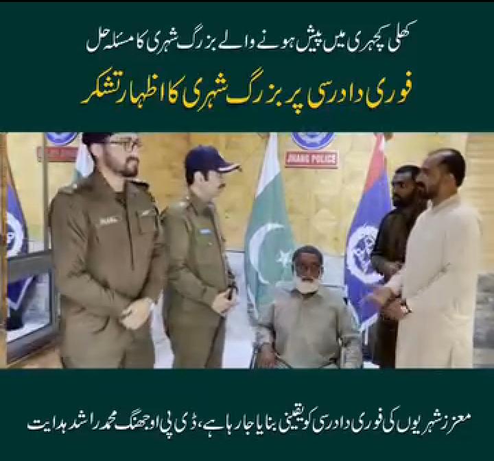 تھی جو کہ بالکل غلط تھی صرف ایک غریب اور بے بس انسان کو ذلیل و خوار کرنے کے لیے تھی لیکن جھنگ ڈی پی او محمد راشد ہدایت کے پاس کھلی کچہری میں بزرگ باپ بیٹے نے پیش ہو کر اپنا موقف پیش کیا جس پر ڈی پی او محمد راشد ہدایت نے فوری طور پر ایکشن لیتے ہوئے تفتیشی کو طلب کر کے ایس پی اور ڈی ایس پی کے زیر نگرانی مقدمہ کی مکمل انکوائری کروا کے 18 اپریل 2024 کو سورج غروب ہونے سے قبل غریب بزرگ محمد شریف کو انصاف دلوا دیا گیا-