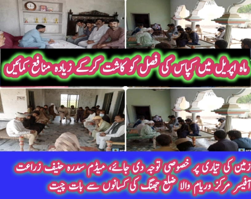 ضلع جھنگ کے معروف علاقہ وریام والا میں زراعت آفسیر کے زیر اہتمام جھنگ کے مختلف علاقوں موضع جات اور چکوک آبادی میں شاندار میٹنگز کی گئیں زراعت آفیسر مرکز وریام والا میڈم سدرہ حنیف نے کاشتکاروں سے کپاس کی زیادہ کاشت ک حوالے سے بات چیت کرتے ہوئےکہا کہ