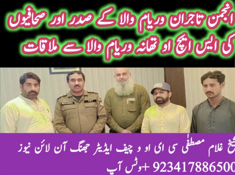وریام والا،مہر ریاض سپرا ایس ایچ او تھانہ وریام والا سے پروفیسر حکیم طاہر محمود جنجوعہ صدر انجمن تاجران وریام والا اور میڈیا نمائندگان میاں عثمان علی مہر ریاض موہانہ اور محمد مظہر محمد شعیب نے ملاقات کی اور انہیں مبارکباد دی اور نیک خواہشات کا اظہار کیا-