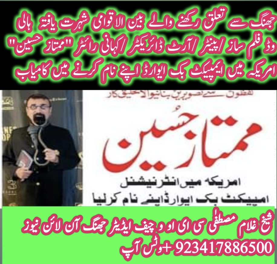 جھنگ (شیخ غلام مصطفٰی) لفظوں سے تصویریں بنانے والا تخلیق کار، بین الاقوامی شہرت یافتہ جھنگ کے رہائشی ہالی وڈ فلمساز / آرٹ ڈائریکٹر /کہانی نویس “ممتاز حسین” امریکہ میں ایمپیکٹ بک ایوارڈ اپنے نام کرنے میں کامیاب، دوست احباب اور اہالیان علاقہ کی جانب سے مبارک باد، رپورٹ پروفیسر حکیم طاہر محمود جنجوعہ ،ڈاکٹر غلام اللہ فاروقی ،انیس احمد پوری نمائندہ خصوصی جھنگ آن لائن نیوز
