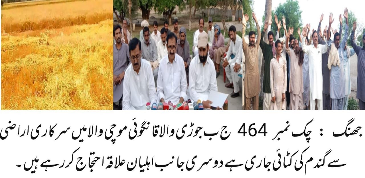 جبکہ ابھی بھی تقریباً 2 کروڑ روپے کی فصل گندم کی کٹائی جاری ہے اور خزانہ سرکار کو مسلسل بھاری نقصان پہنچایا جا رہا ہے ۔ اہلیان علاقہ کا کہنا ہے کہ ناجائز قابضین کی جانب سے اہلیان علاقہ کو آتشیں اسلحہ سے مسلسل ڈرایا دھمکایا جاتا ہے جس سے نقص امن کا شدید خطرہ ہے ۔ چک 464 ج ب جوڑی والا قانگوئی موچی والا کے رہائشیوں نے وزیر اعلی پنجاب محترمہ مریم نواز ، کمشنر فیصل آباد اور ڈپٹی کمشنر جھنگ سے اس بابت نوٹس لینے اور کاروائی کی درخواست کی ہے ۔