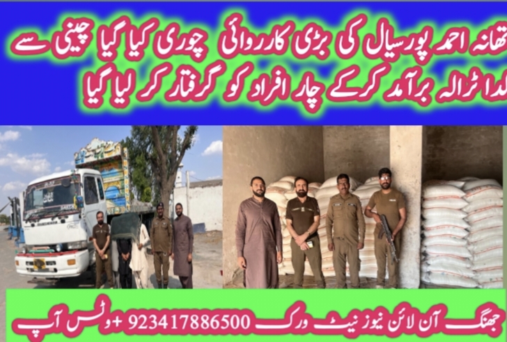تفصیلات کے مطابق پولیس تھانہ احمد پور سیال نے چینی سے لدے ٹرالہ کی چوری میں ملوث کے خلاف کاروائی کرتے ہوئے 4 کس ملزمان محمد اجمل ، محمد طارق ، محمد اکمل اور اختر کو گرفتار کر لیا ۔