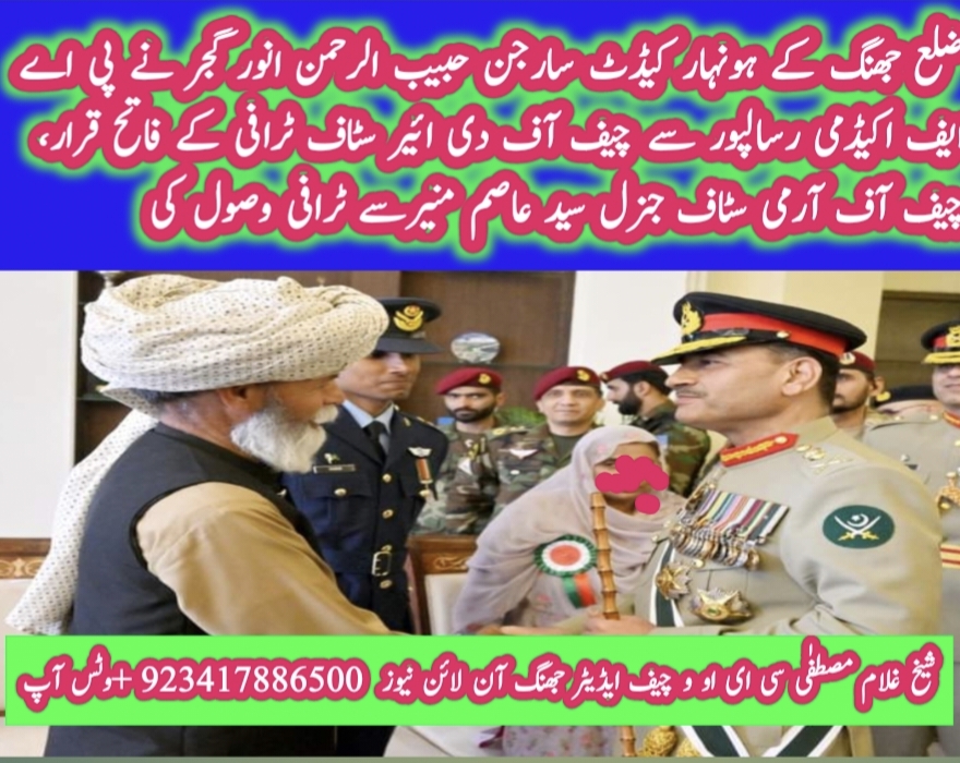 وریام والا جھنگ (شیخ غلام مصطفٰی) نواحی مثالی گاؤں چک نمبر 491 کے رہائشی ایوی ایشن کیڈٹ سارجن حبیب الرحمن گجر نے پی اے ایف اکیڈمی رسالپور سے چیف آف دی ایئر ٹرافی کے فاتح قرار پائے، دوران پیریڈ انہوں نے چیف آف دی آرمی سٹاف جنرل سید عاصم منیرسے ٹرافی وصول کی…