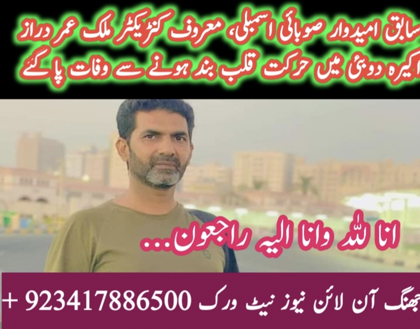 سابق امیدوار صوبائی اسمبلی کنریکٹر ملک عمردراز اکیرہ دوبئی میں ہارٹ اٹیک کے باعث انتقال کر گئے عمردراز اکیرہ کچھ عرصہ قبل دوبئی شفٹ ہوگئے تھے-