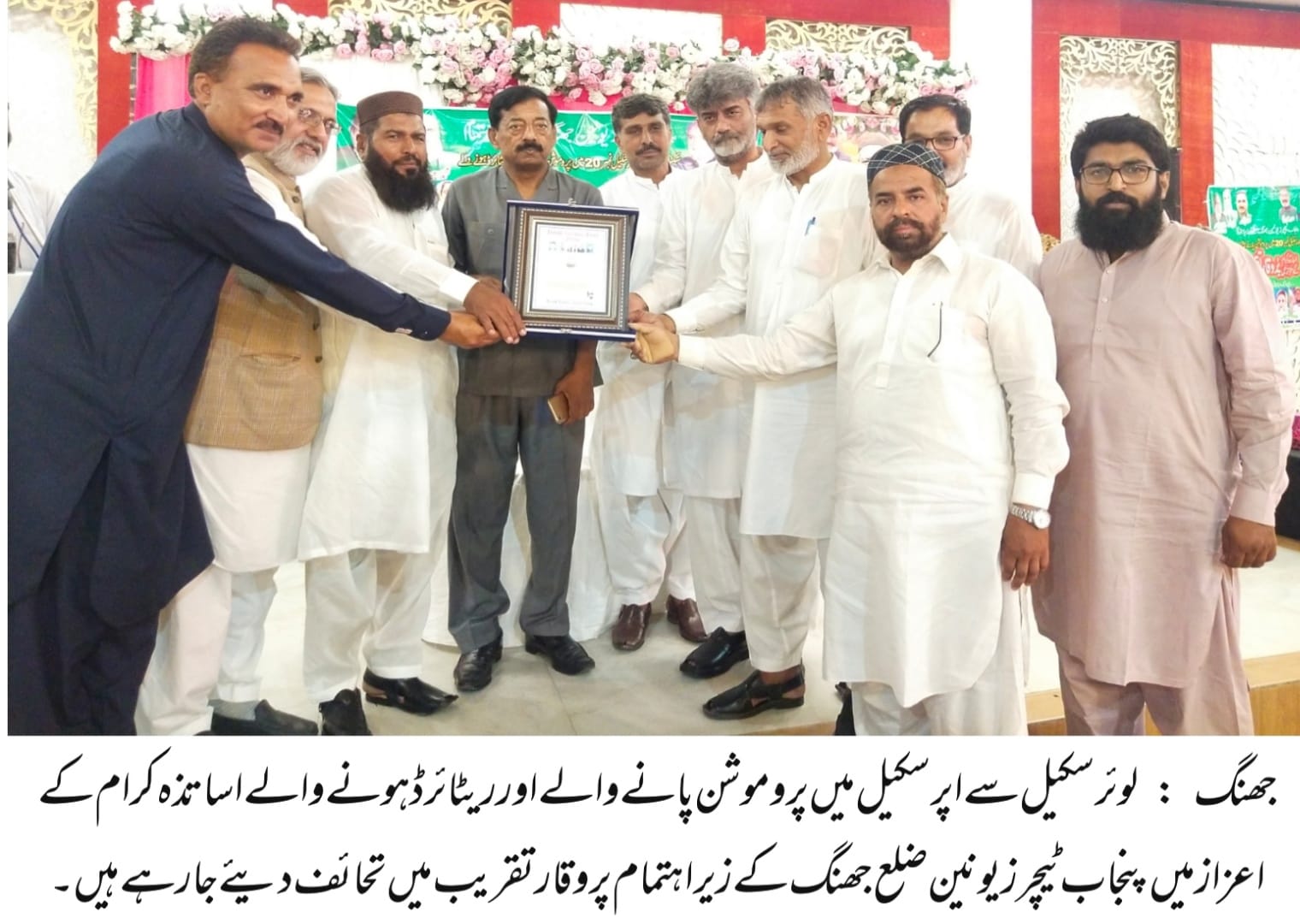 جھنگ ( محمد ریاض شاہد ) سکیل نمبر 19 اور سکیل نمبر 20 میں پروموشن پانے والے اور ریٹائرڈ ہونے والے اساتذہ کرام کے اعزاز میں پنجاب ٹیچرز یونین ضلع جھنگ کے زیر اہتمام پروقار تقریب کا اہتمام کیا گیا-