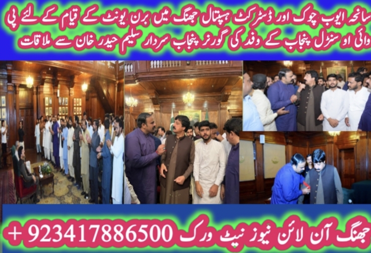 گورنر پنجاب سردار سلیم حیدر خان سے چوہدری فہیم عباس راہی ڈپٹی انفارمیشن سکیرٹری پی وائی او سنڑل پنجاب ، سلیمان ملک ، چوہدری سمیع چدھڑ ، عرفان حیدر سیال ، ذیشان ملک کی ملاقات ہوئی گورنر پنجاب ،انفارمیشن سکیرٹری پی پی پی پنجاب شہزاد سعید چیمہ اور پی وائی پنجاب کے وفد نے