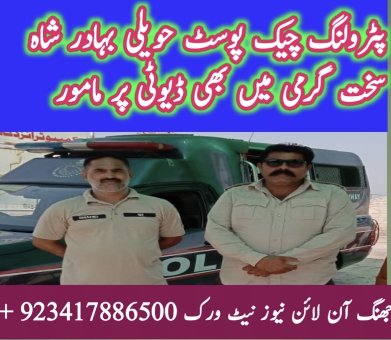 جھنگ (شیخ غلام مصطفٰی ) پٹرولنگ پولیس چوکی حویلی بہادر شاہ سخت گرمی میں بھی فرض کی ادائیگی میں مصروف کڑی دھوپ میں نوجوان ڈیوٹی پر مامور تھے ان کا کہنا تھا کہ ہم پوری ایمانداری سے عوام کی خدمت کے لیے حاضر ہیں ہر طرف سے عوامی خدمت عبادت سمجھ کر کر رہے ہیں-