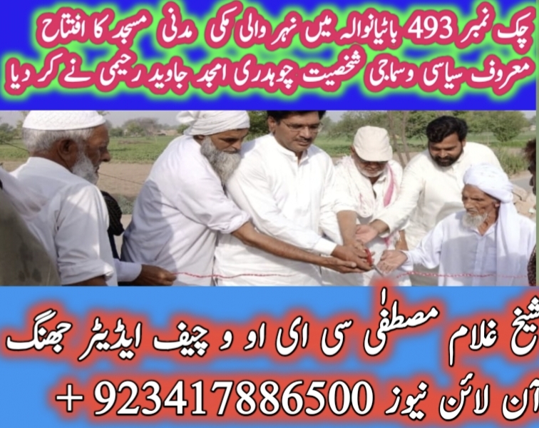 چک نمبر 493 باٹیانوالہ کی نہر والی مکی مدنی مسجد کی تعمیر کے منصوبے کا افتتاح باٹیانوالہ کہ معروف سماجی شخصیت چوہدری امجد جاوید رحیمی نے کیا۔ اس موقع پر نہوں نے کہا کہ مکی مدنی مسجد چک نمبر 493 باٹیانوالہ کے توسیعی تعمیراتی منصوبے ( ری کنسٹرکشن) کا افتتاح کرنا میرے لئے بہت بڑے اعزاز کی بات ہے۔