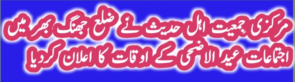 مرکزی جمعیت اہلحدیث ضلع جھنگ کے امیر حافظ نعیم الحق عیدگاہ اہلحدیث حویلی بہادر شاہ میں 7بجے مرکزی عید گاہ اہلحدیث محلہ کچکوٹہ شورکوٹ میں مولانا عباس فاروقی پونے سات بجے مدرسہ تعلیم القران والحدیث کوٹلہ ظریف میں پرنسپل قاری حمزہ مکی پونےسات بجے نمازعید پڑھائیں گے-