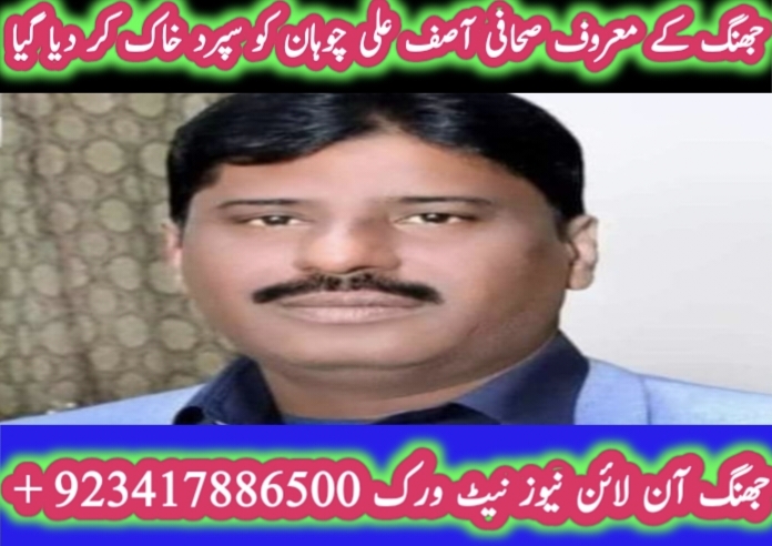 جھنگ (شیخ غلام مصطفٰی)جھنگ کے معروف صحافی آصف علی چوہان حرکت قلب بند ہونے سے جان بحق،ہزاروں افراد کی نماز جنازہ میں شرکت، مقامی قبرستان میں سپرد خاک، 16جون بروز اتوار کو صبح 8 بجے رسم قل خوانی مرحوم کی رہائش گاہ واقع کوٹ روڈ پر ادا کی جائے گی،رپورٹ جاوید اقبال ملاح بیورچیف جھنگ آن لائن نیوز