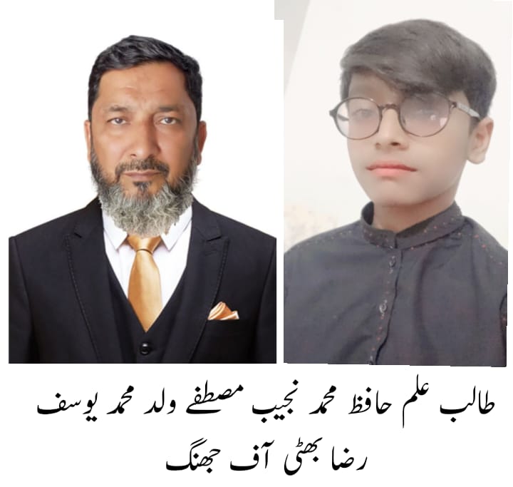 آفیسر سکول سسٹم کینال روڑ جھنگ کے ہونہار طالب علم صاحبزادہ حافظ محمد نجیب مصطفے نے فیصل آباد بورڈ کے میٹرک کے سالانہ امتحان 2024 میں 1064 نمبر لیکرطلبہ میں ضلع بھرمیں شاندار کامیابی حاصل کرلی۔