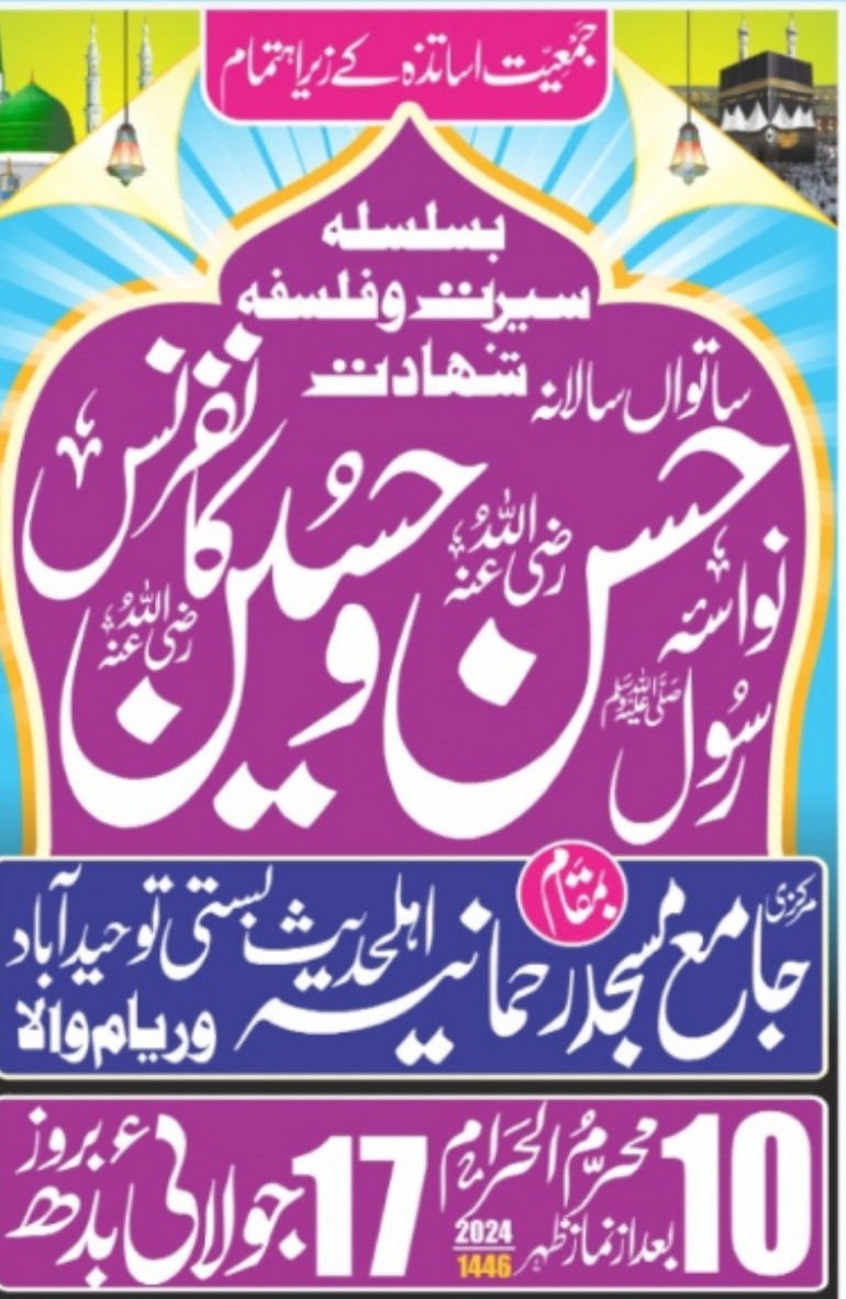 وریام والا جمعیت اساتذہ ضلع جھنگ کے زیر اہتمام 7سالانہ فلسفہ شہادت امام حسن وحسین رض کانفرنس 17جولائی بروز بدھ بعد از نماز ظہر بمقام مرکزی جامع مسجدِ رحمانیہ اہلحدیث بستی توحید اباد وریام والا تحصیل شورکوٹ میں سابقہ روایات کی طرح منعقد ہورہی ہے –