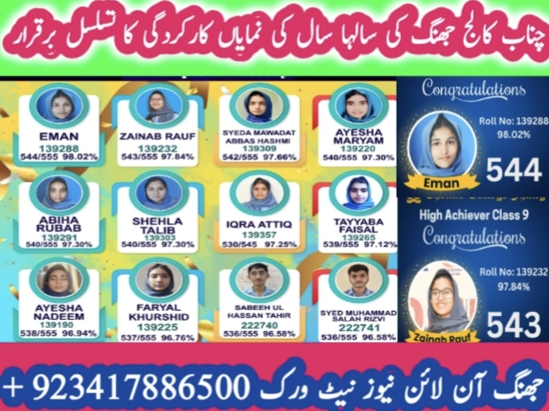 چناب کالج کے 504 طلبہ نے نہم کا امتحان دیا جن میں سے367 طلبہ نے اے پلس اور اےگریڈ حاصل کیا جو کالج کے تعلیمی معیار اور طلبہ کی محنت کا ثمر اور عزم کا مظہر ہے۔ دریں اثنا پرنسپل جناب کالج جھنگ لیفٹیننٹ کرنل (ر)اعظم مقبول صدیقی نے طلبہ کی شاندار کامیابی پر فخر و مسرت کا اظہار کیا اور مثالی نتائج کی فراہمی میں اساتذہ کی کوششوں کو سراہا۔