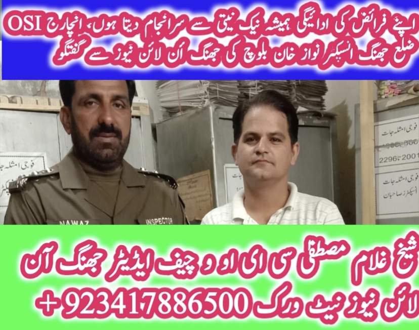 جھنگ (شیخ غلام مصطفیٰ) اپنے فرائض کی ادائیگی ہمیشہ نیک نیتی سے سرانجام دیتا ہوں، محنت کی عظمت سے ہی ہمیشہ صلہ ملتا ہے، OSI ضلع جھنگ انسپکٹر نواز خان بلوچ کی جھنگ آن لائن نیوز سے گفتگو، رپورٹ عرفان حیدر سیال ڈویژنل بیوروچیف جھنگ آن لائن نیوز
