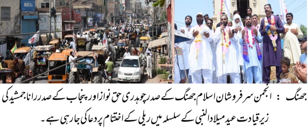 جھنگ(شیخ غلام مصطفیٰ ) انجمن سرفروشان اسلام جھنگ کی جانب سے جشن عید میلادالنبی صلی اللہ علیہ وسلم کی خوشی میں ٹریکٹر ریلی و جلوس کا انعقاد کیا گیا ۔