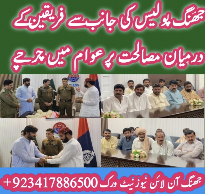 پولیس کے احسن اقدام کو سراہتے ہوئے اہلیان علاقہ کا اظہار تشکر ۔ تفصیلات کے مطابق علاقہ تھانہ موچیوالا اور کوتوالی میں مگھیانہ اور نول برداری کے درمیان دیرینہ تنازعہ قتل و غارت کی طرف بڑھ رہا تھا ۔ جھنگ پولیس کی طرف سے انسانی جانوں کے تحفظ اور دیرینہ دشمنی کے خاتمے کیلئے مصالحتی کردار ادا کرتے ہوئے فریقین میں صلح کروا دی گئی ۔